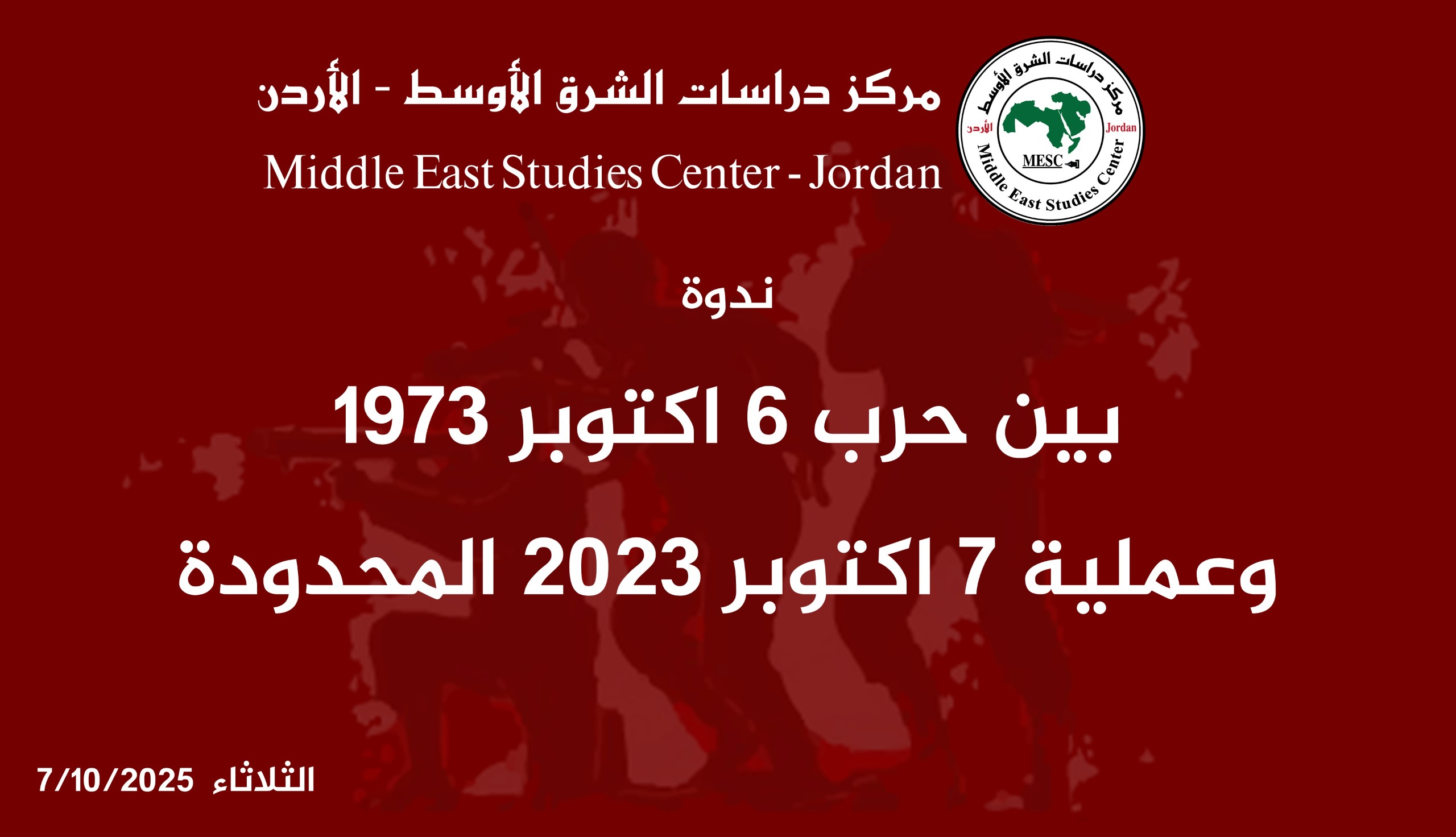دعا المتحدثون في الندوة التي أقامها مركز دراسات الشرق الأوسط في عمّان مساء الثلاثاء 7/10/2025، تحت عنوان "بين حرب 6 أكتوبر 1973، وعملية 7 أكتوبر 2023"، إلى دراسة التحوّلات والانعكاسات على القضية الفلسطينية والأمة العربية والإسلامية، بخصوص الصراع مع إسرائيل ما بين عامَيْ 1973-2023، وبناء استراتيجية سياسية شاملة تحافظ على مكتسبات عملية 7 أكتوبر.