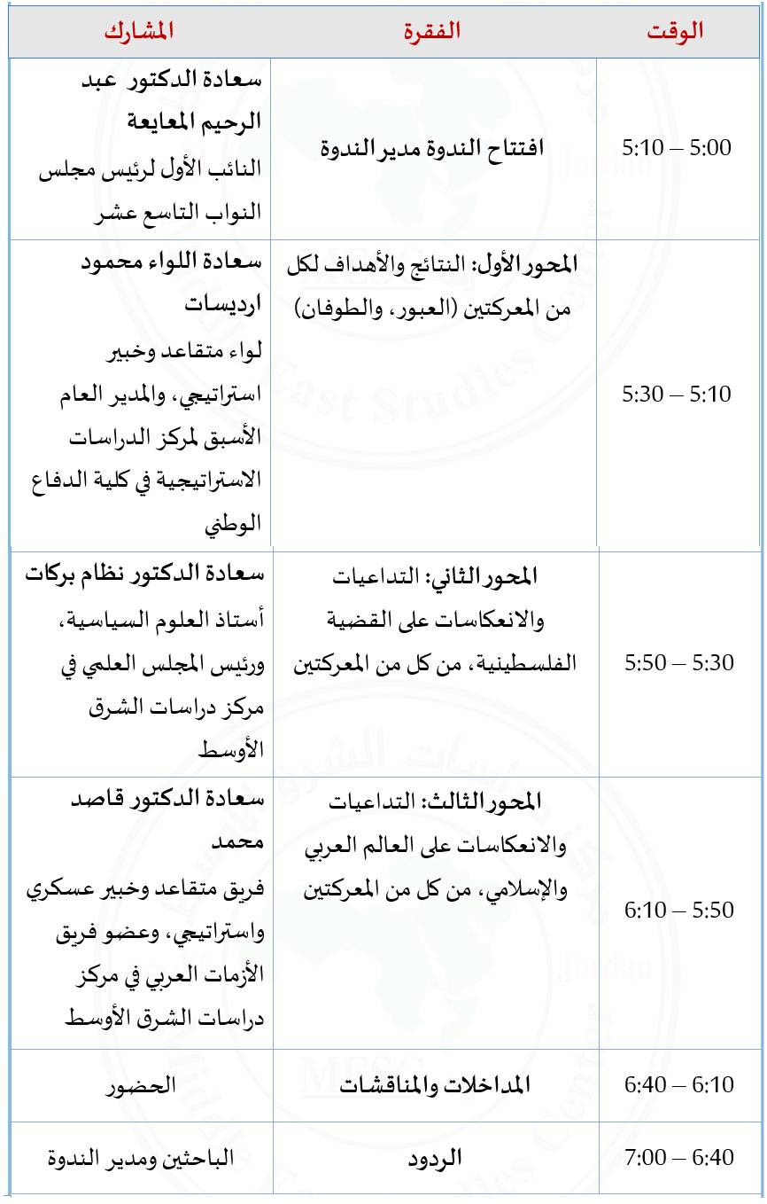 وناقشت الندوة التي أدارها د. عبد الرحيم معايعة النائب في المجلس النيابي التاسع عشر، وشارك فيها أكاديميون وخبراء تداعيات ونتائج كل من المعركتين على القضية الفلسطينية وعلى العالم العربي والإسلامي، إضافة إلى العبر والدروس المستفادة وسبل الاستفادة منها في رسم استراتيجيات الصراع العربي- الإسرائيلي للعقد القادم، بعد محاولات إعادة احتلال قطاع غزة واستيطانه، وقيام إسرائيل بإبادة جماعية وجرائم حرب ضد المدنيين، والمصادرة والاستيطان والضمّ في الضفة الغربية، واستهداف بعض العواصم العربية والإسلامية بالقصف، وإعلان مشروع إسرائيل الكبرى.