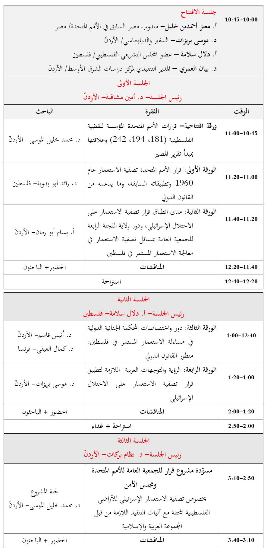 وتسعى الندوة إلى مناقشة كيفية تطبيق قرار الأمم المتحدة بشأن تصفية الاستعمار (القرار 1514 لسنة 1960) على حالة الاحتلال الإسرائيلي المستمر للأراضي الفلسطينية المحتلة، وإبراز أن نضال الشعب الفلسطيني يدخل ضمن حركات التحرر الوطني التي أقرّتها الأمم المتحدة ودعمها القانون الدولي.